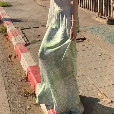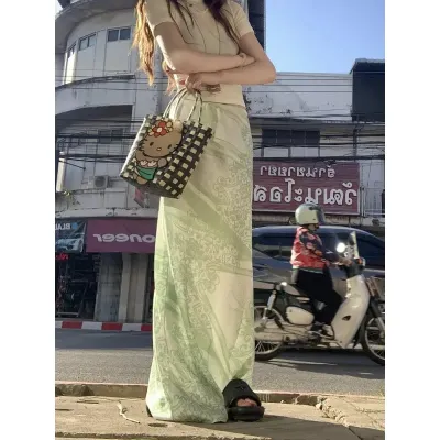 American Floral Print Casual Green A-line Skirt Women 2025 Summer New High Waist Fashion All Match Patchwork Mid-length Skirt
