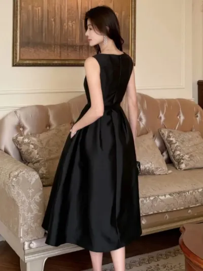 Vintage Black Midi Dress for Women Elegant Hepburn Style Sleeveless Evening Party Dresses Summer A-line Vestidos Casual Robe New