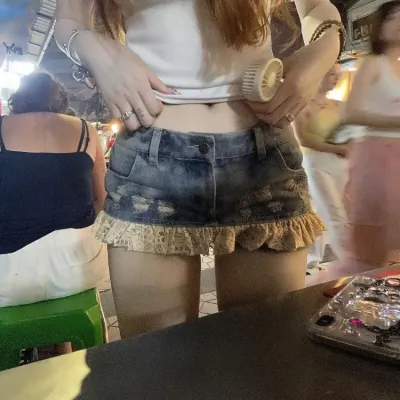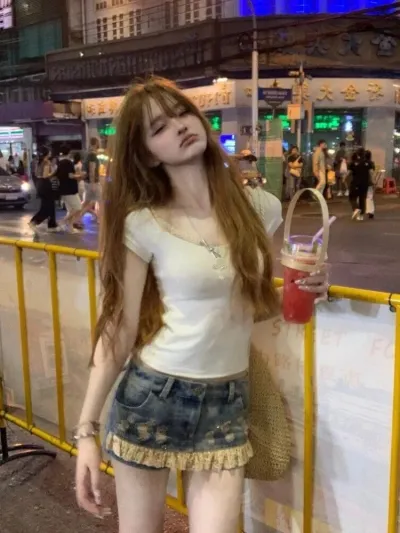 Fashion Street Lace Patchwork Denim Skirt for Women Vintage Hole Washed Low-waist Skirts 2025 Summer New Blue Faldas De Mujer