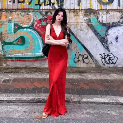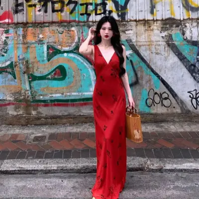 High end Glamorous Socialite Party Evening Red V-neck Sexy Camisole Dress Slim Fit Sleeveless Bodycon Maxi Dresses for Women