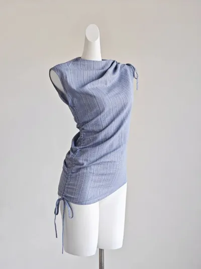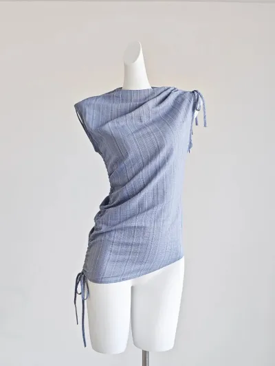 French Blue Striped Drawstring Strap Shirt for Women Summer Outfit Sweet GirlI Irregular Slim Fit Sleeveless Blouses Women Tops