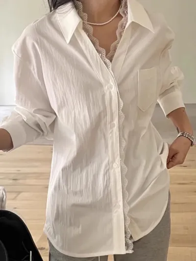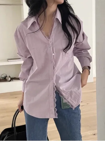 Elegant Korean Chic Spring New Niche Design Lace Stitching Loose Casual Long Sleeved Shirt Top Women