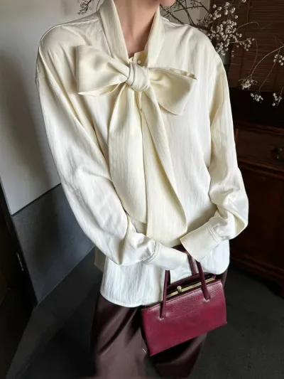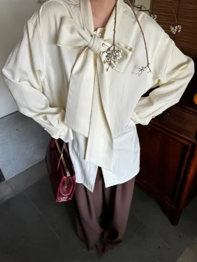 Elegant Beige Blouse Women Chic Bow Tie Long Sleeve Shirt Female Oversized Office Ladies Fashion Vintage Spring Clothes