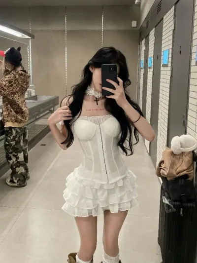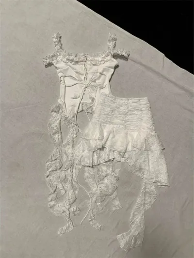Women Fairycore Two Piece Set Lace Strap Top and Irregular Ruffle Mini Skirt Slim Fit Suit White Sweet Y2K Style Summer Outfit