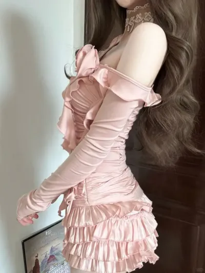 Spring New Stylish Sweet Girl Slim Fit Ruffle Edge Pleated Off Shoulder Top Mini Skirt Set Pink Two Piece Sets Women Outfits
