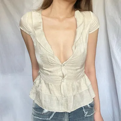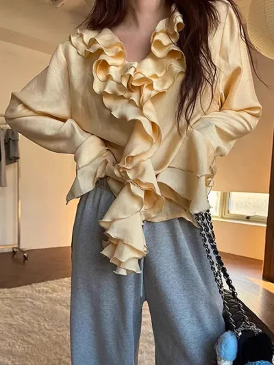 2025 Elegant V-neck Ruffled Flared Sleeve Shirt Women Spring Retro and Stylish Loose Niche Versatile Blouse Top