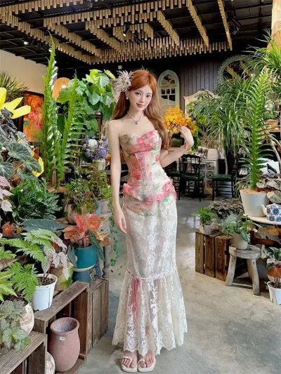 Summer Women Two Piece Set Floral Corset Top and Lace Midi Skirt Elegant Mesh Outfit Slim Fit Vintage French Style Beach Suit