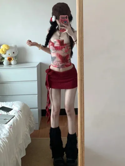 Women Y2K Two Piece Set Butterfly Print Tube Top and Knitted Side Tie Mini Skirt Slim Fit Suit Sexy Club Summer Street Outfit
