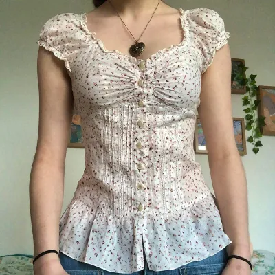 Floral Print Ruched A-line Blouse French Style Single-breasted Short Sleeve Top Chic Slimming Tie-up Collar Shirts Cute