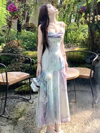 Sweet Printcess Midi Dress for Women Elegant Spaghetti Strap Fairy Birthday Party Dress Summer Ball Gown Korean Female Vestidos