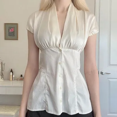 French Retro Satin A-line Shirt Chic Fashion Slimming Short Sleeve V-neck Blouses Office Ladies Elegant Top All-match