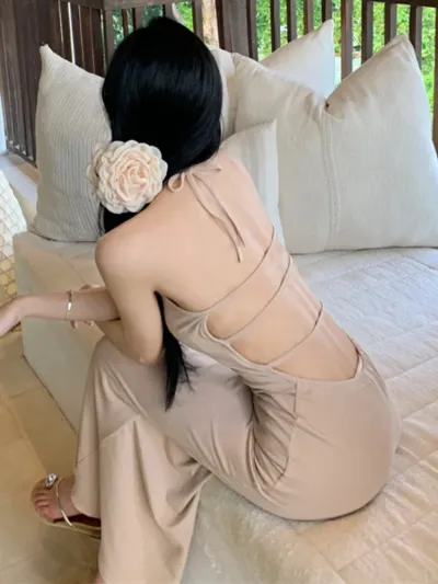 Sexy Elegant New Slim Sleeveless Solid Midi Dresses Women Fashion Halterneck Backless Birthday Party Bodycon Dress
