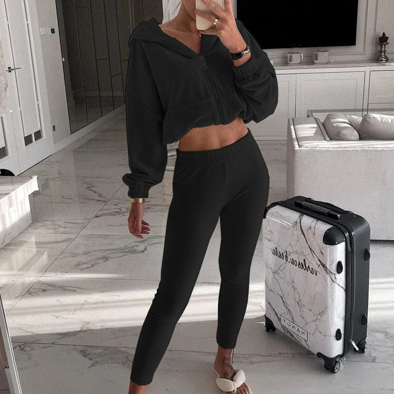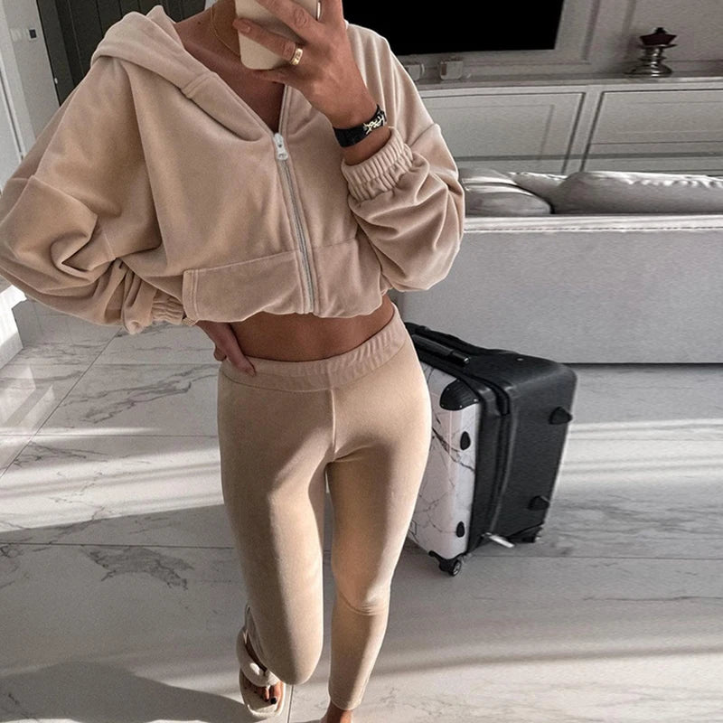 Fall Winter Solid Soft Velvet Outfit Women Zipper Hooded Sweatshirt Coat+Slim Pants Tracksuit Retro Long Sleeve Sports Suit Sets